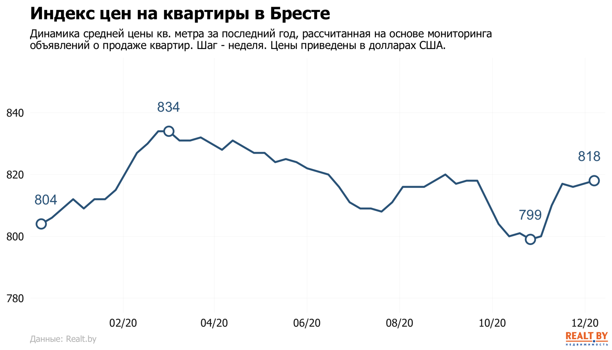 Средняя цена в объявлениях о продаже квартир в Бресте выросла на 0.1% и составила 818 $/м2.