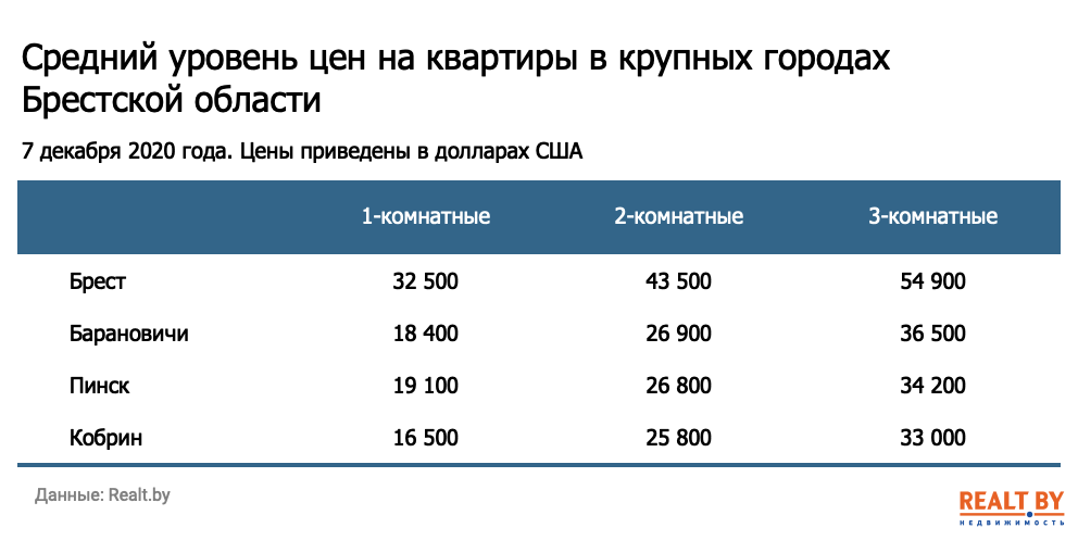 Мониторинг цен предложения квартир в Бресте и городах Брестской области за 30 ноября — 7 декабря 2020 года