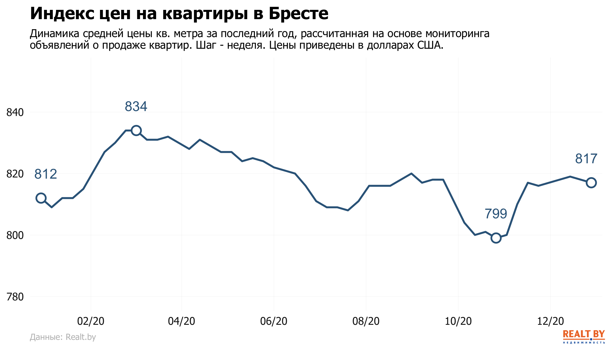 Средняя цена в объявлениях о продаже квартир в Бресте снизилась на 0.1% и составила 817 $/м2.