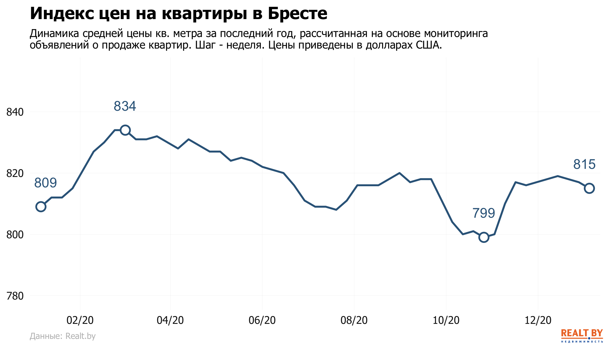 Средняя цена в объявлениях о продаже квартир в Бресте снизилась на 0.2% и составила 815 $/м2.