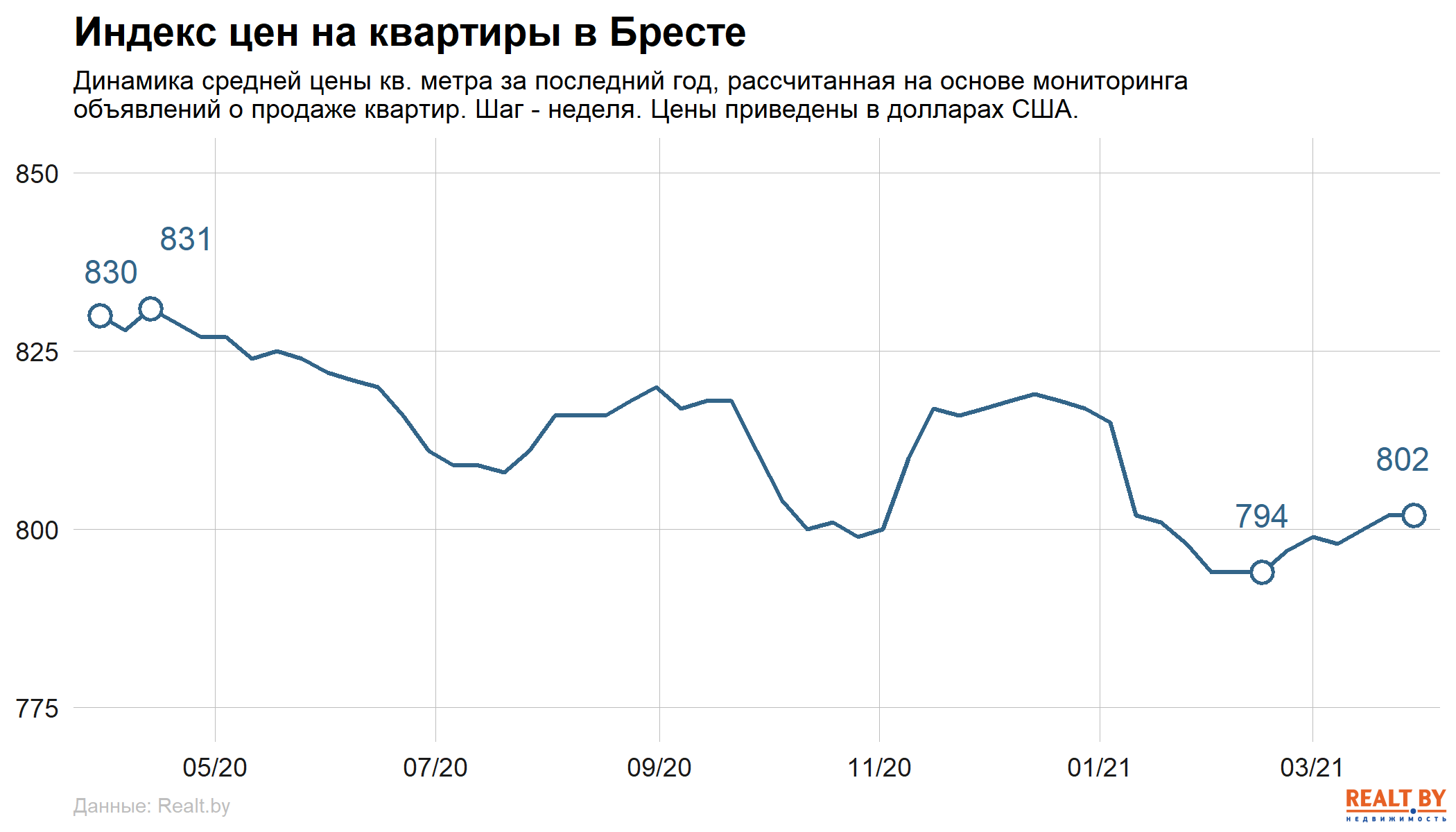 Средняя цена в объявлениях о продаже квартир в Бресте не изменилась и составила 802 $/м2.