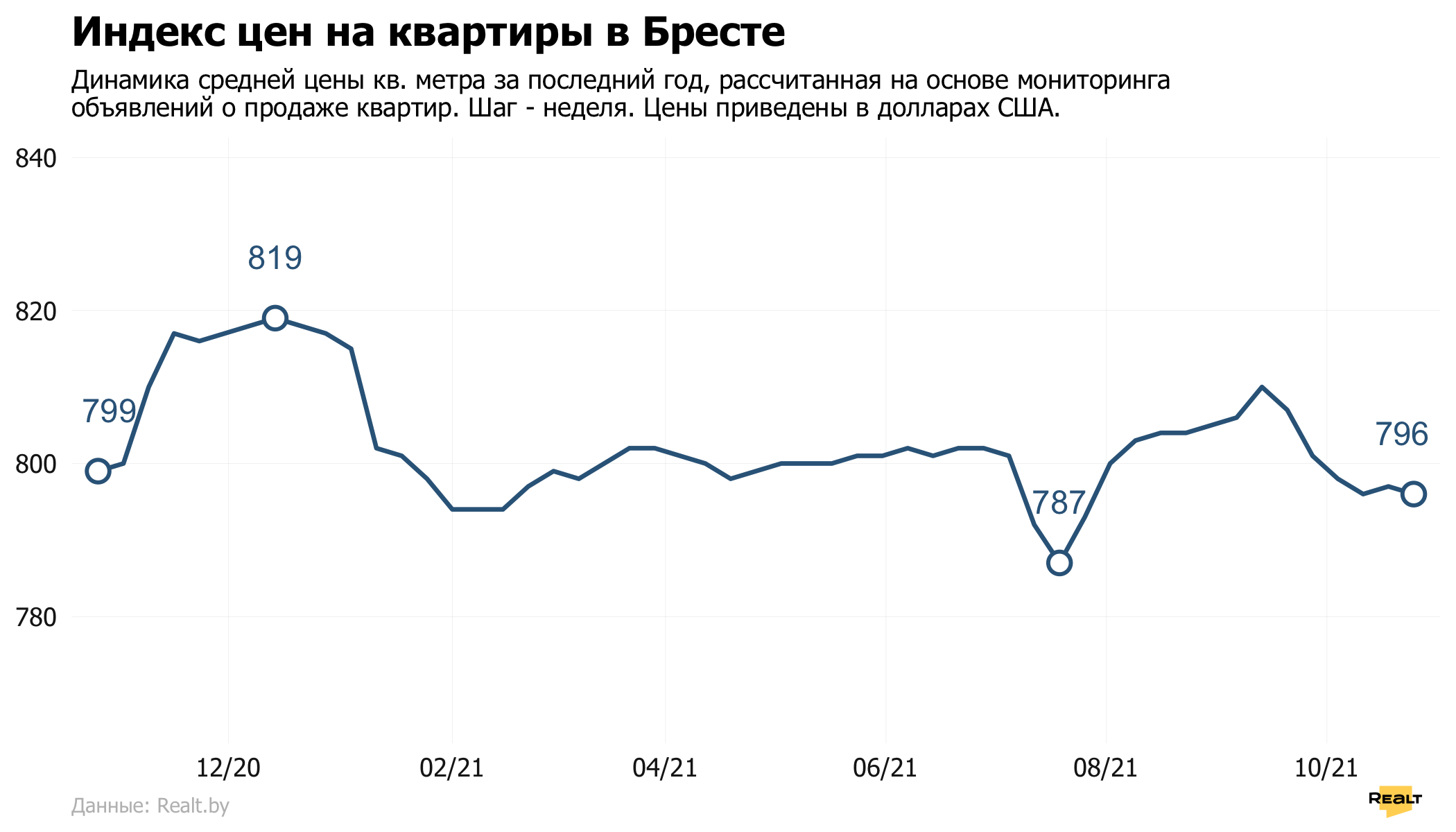 Средняя цена в объявлениях о продаже квартир в Бресте снизилась на 0.1% и составила 796 $/м2.