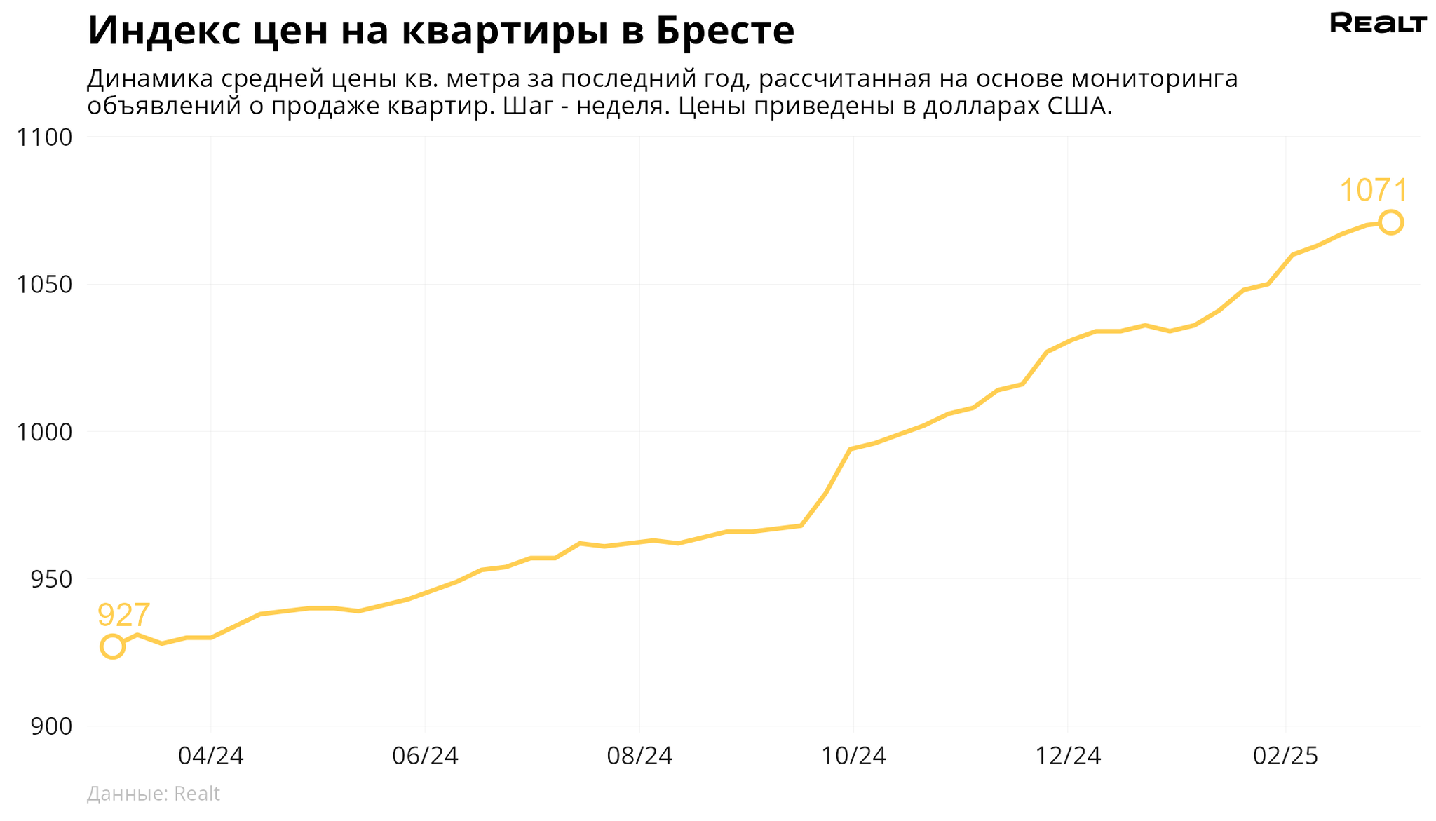 На 1.1% выросла средняя цена предложения квартир в Барановичах — до 618 $/м2. В Пинске квартиры продавались в среднем за 590 $/м2 (без изменений за неделю). В Кобрине средняя цена квадратного метра в объявлениях о продаже квартир составила 735 $ (+0.8%).