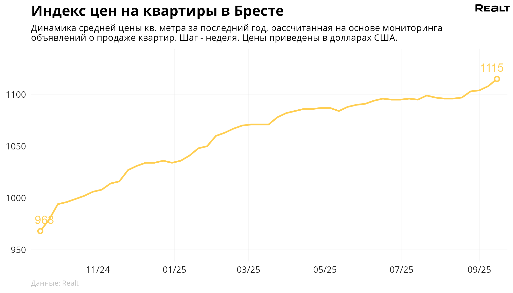 За неделю, с 8 по 15 сентября 2025 года, средняя цена в объявлениях о продаже квартир в Бресте выросла на 0.6% и составила 1115 $/м2. При этом количество квартир в продаже уменьшилось на 1.2%. Что еще произошло на рынке жилья крупнейших городов Брестской области за семь дней — в материале.