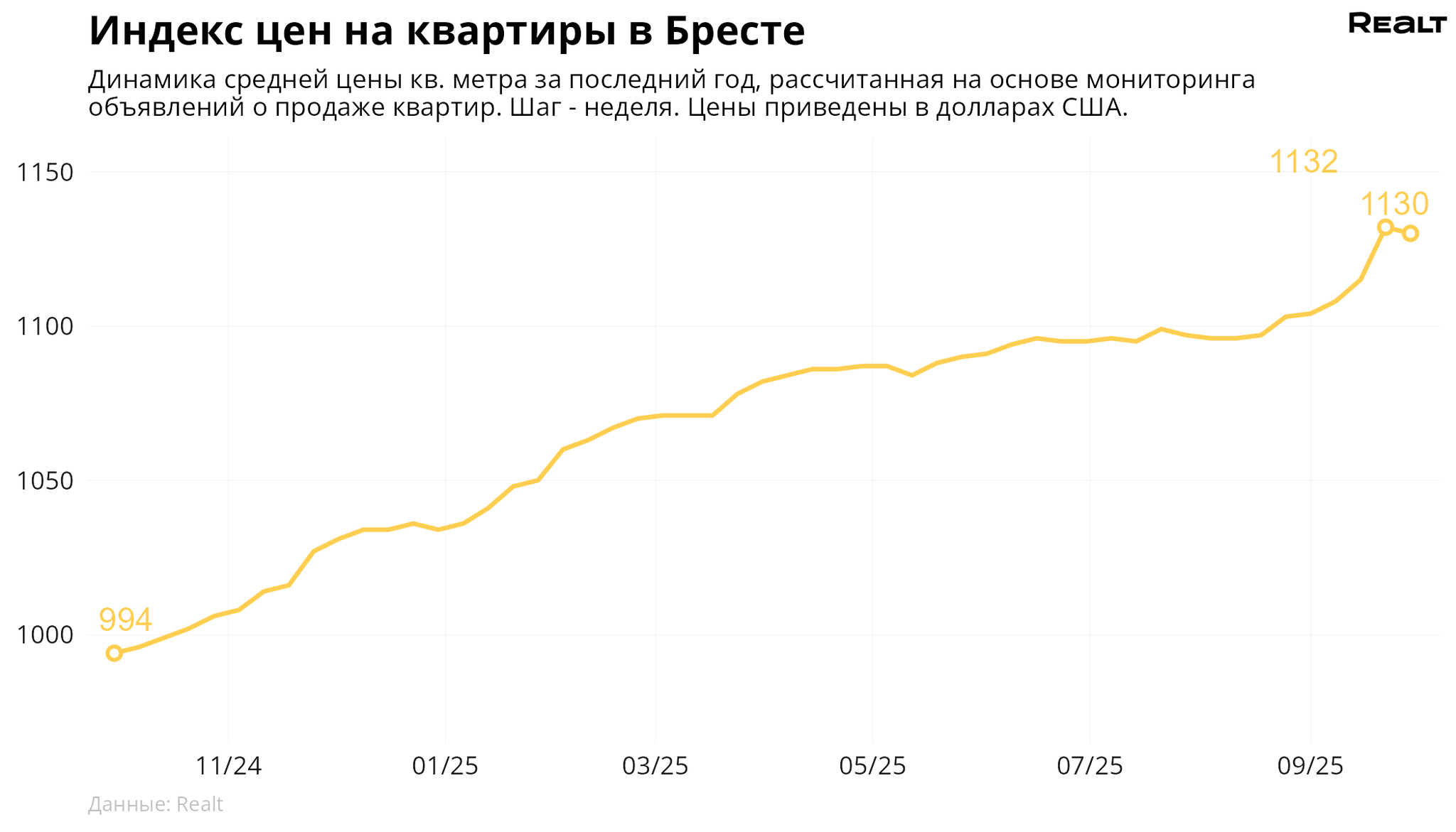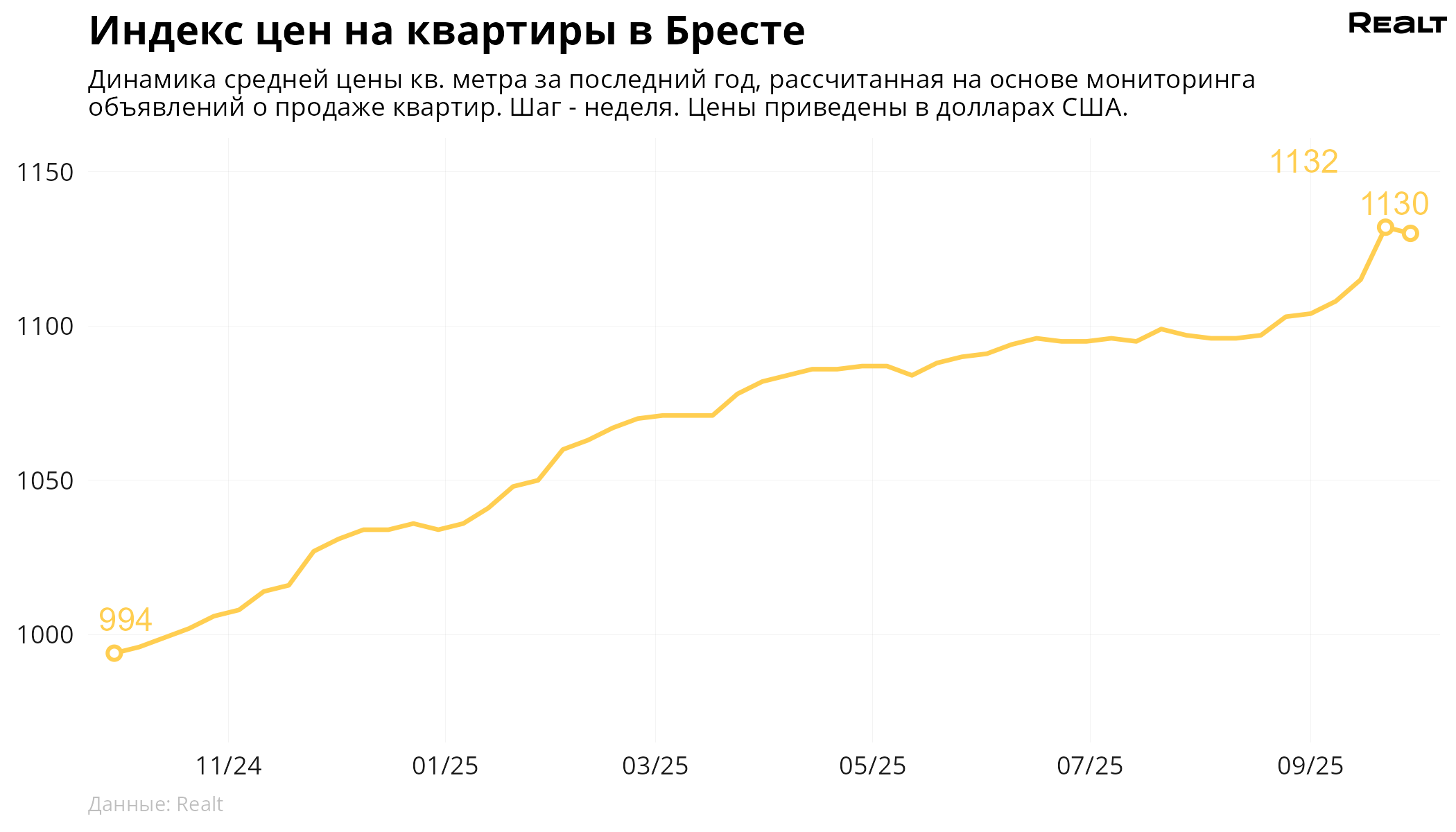 За неделю, с 22 по 29 сентября 2025 года, средняя цена в объявлениях о продаже квартир в Бресте снизилась на 0.2% и составила 1130 $/м2. При этом количество квартир в продаже увеличилось на 0.6%. Что еще произошло на рынке жилья крупнейших городов Брестской области за семь дней — в материале.