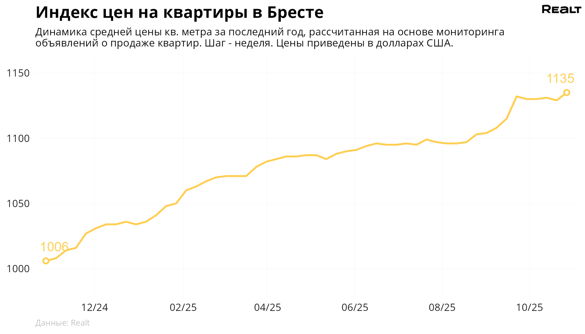 За неделю, с 20 по 27 октября 2025 года, средняя цена в объявлениях о продаже квартир в Бресте выросла на 0.5% и составила 1135 $/м2. При этом количество квартир в продаже уменьшилось на 1.2%. Что еще произошло на рынке жилья крупнейших городов Брестской области за семь дней — в материале.