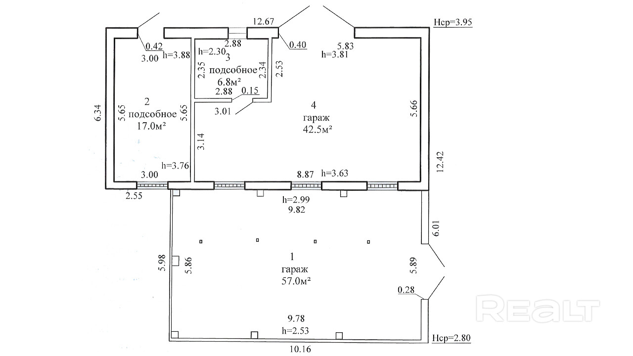 Помещение представляет собой две основные части с двумя въездными воротами - 42.5/57 кв.м, подсобные помещения - 6.8/ 17 кв.м, навес.