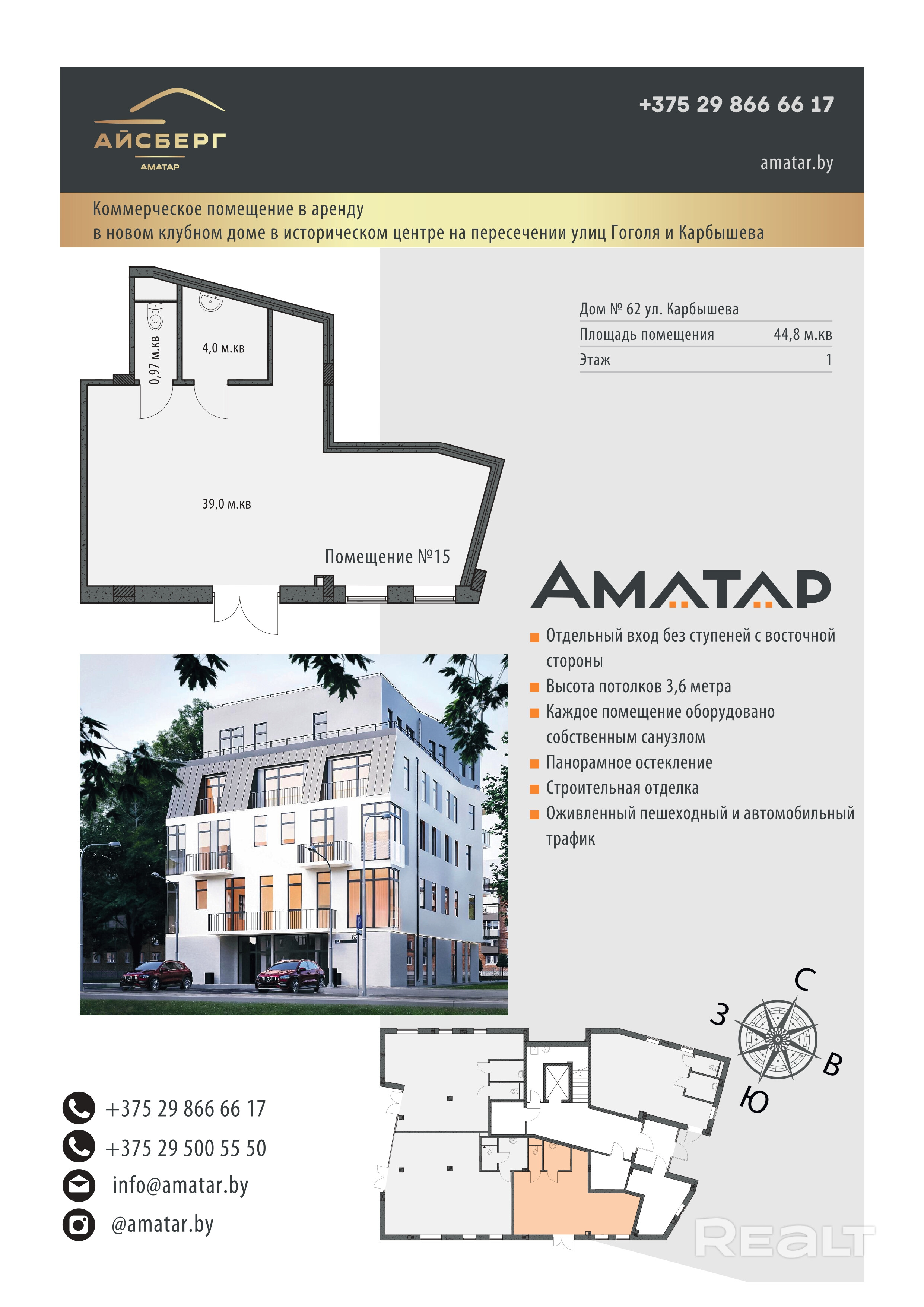 Административное помещение площадью 72,4 м2 новом клубном доме «Айсберг» в идеальной локации на пересечении Гоголя и Карбышева • Отдельный вход без ступеней с улицы Карбышева • Панорамное остекление • Потолки 3,6 метра • Монолитный конструктив здания • Оживленный пешеходный и автомобильный трафик