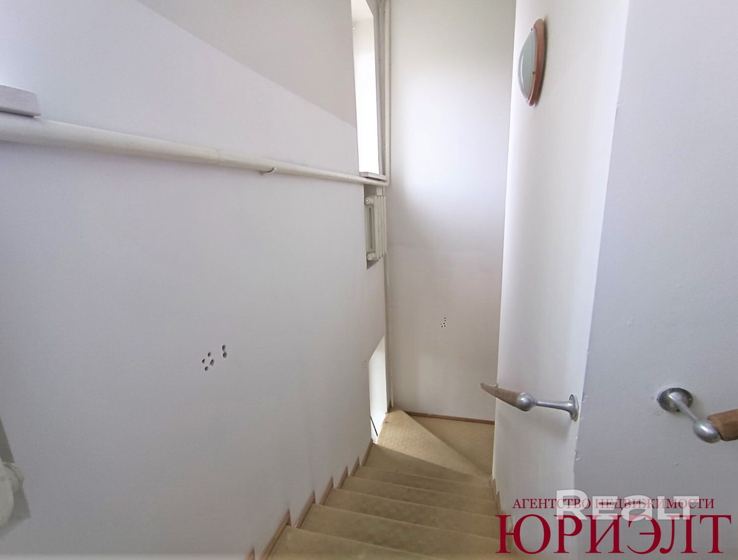 С первого на второй этаж ведёт железобетонная лестница, обтянутая ковровым покрытием.