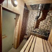 - На первом этаже - теплая терраса, кухня-столовая с фирменной начинкой, комната с камином. Баня с зоной отдыха и все подсобные помещения.
