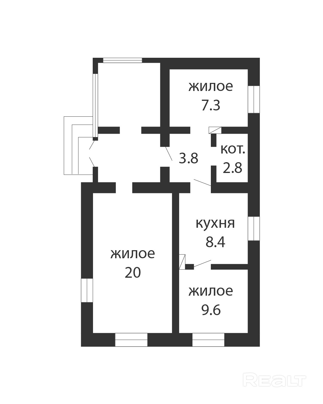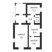 По планув доме находятся 3 жилые комнаты, самой большой является комната площадью 20 м2. Также имеется кухня площадью 8.35 м2.