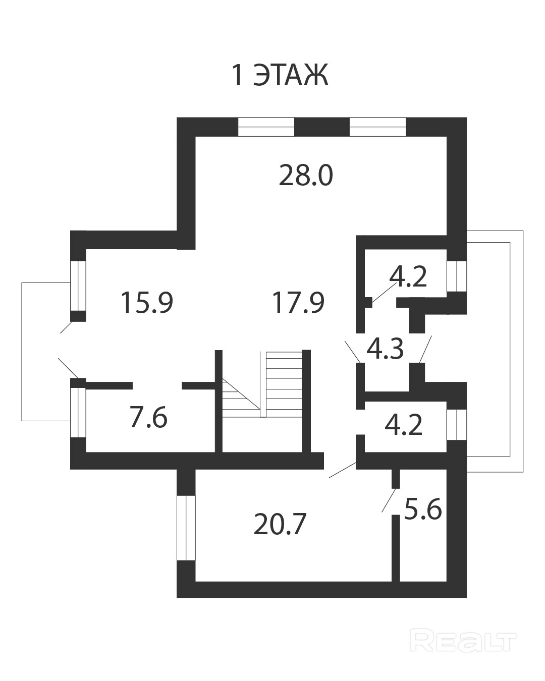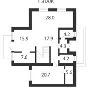 На первом этаже расположены кухня и столовая общей площадью 23.5 м2, спальня (20 м2) с отдельным санузлом (5.6 м2), просторная гостиная (28 м2), холл (18 м2), котельная (4.2 м2) с местом для стиральной машины и санузла, тамбур (4.3 м2) и гардероб (4.2 м2). Здесь предусмотрено место для камина и выход на террасу, что делает пространство еще более привлекательным для отдыха на свежем воздухе.