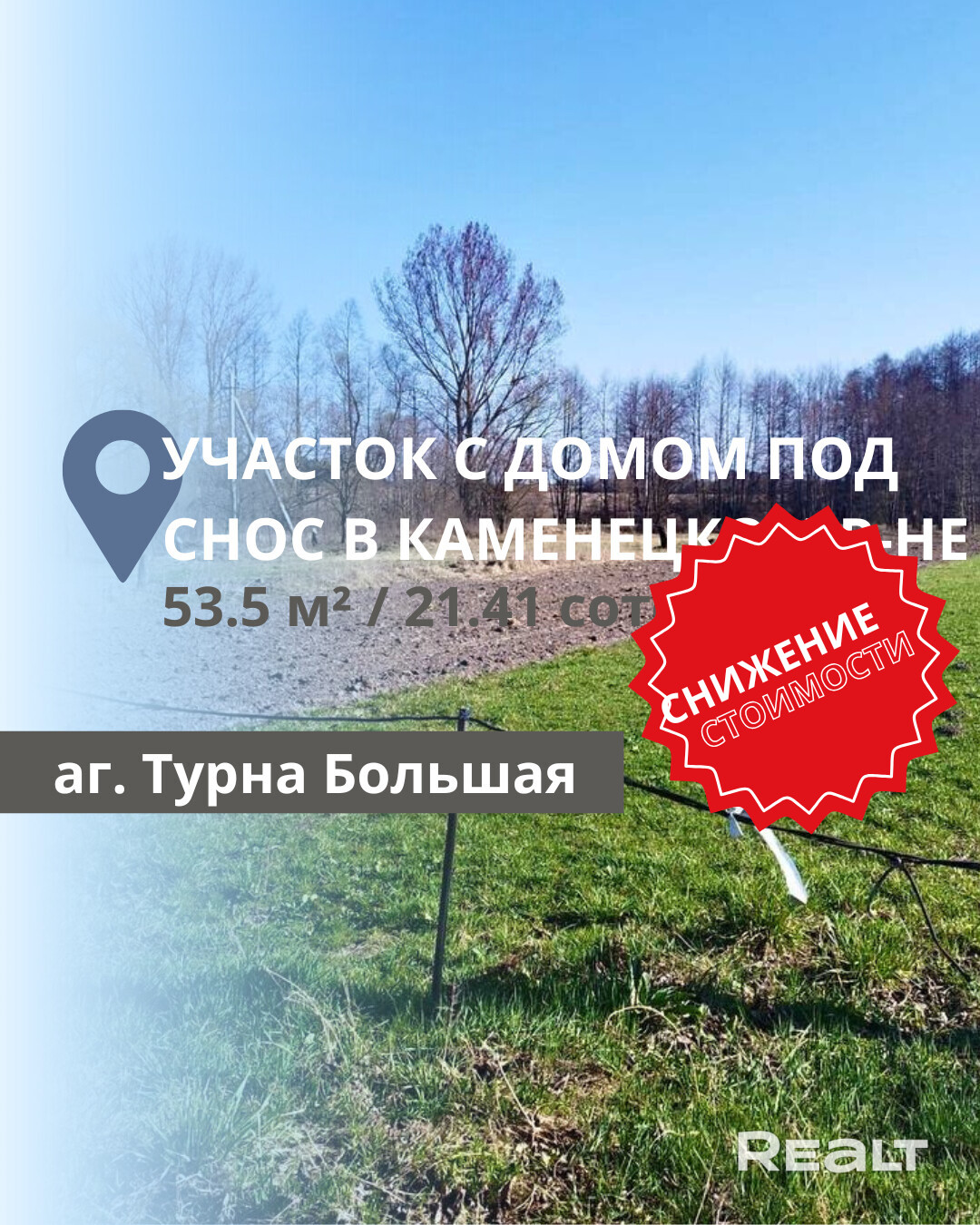 Продается участок с домом под снос в агрогородке Турна Большая, Каменецкий район. Общая площадь дома составляет 53,5 м2, а площадь участка — 21,41 сотки, дополнительно имеется 11,76 соток ЛПХ. На участке расположена блочная хозяйственная постройка размером 10x20 м, использовавшаяся для разведения животных, а также сухой погреб площадью 5x5 м. Коммуникации: газ — по улице, электричество — 380 Вт, вода — скважина. Участок отличается хорошим сообщением с Брестом, а также имеет развитую инфраструктуру в агрогородке.