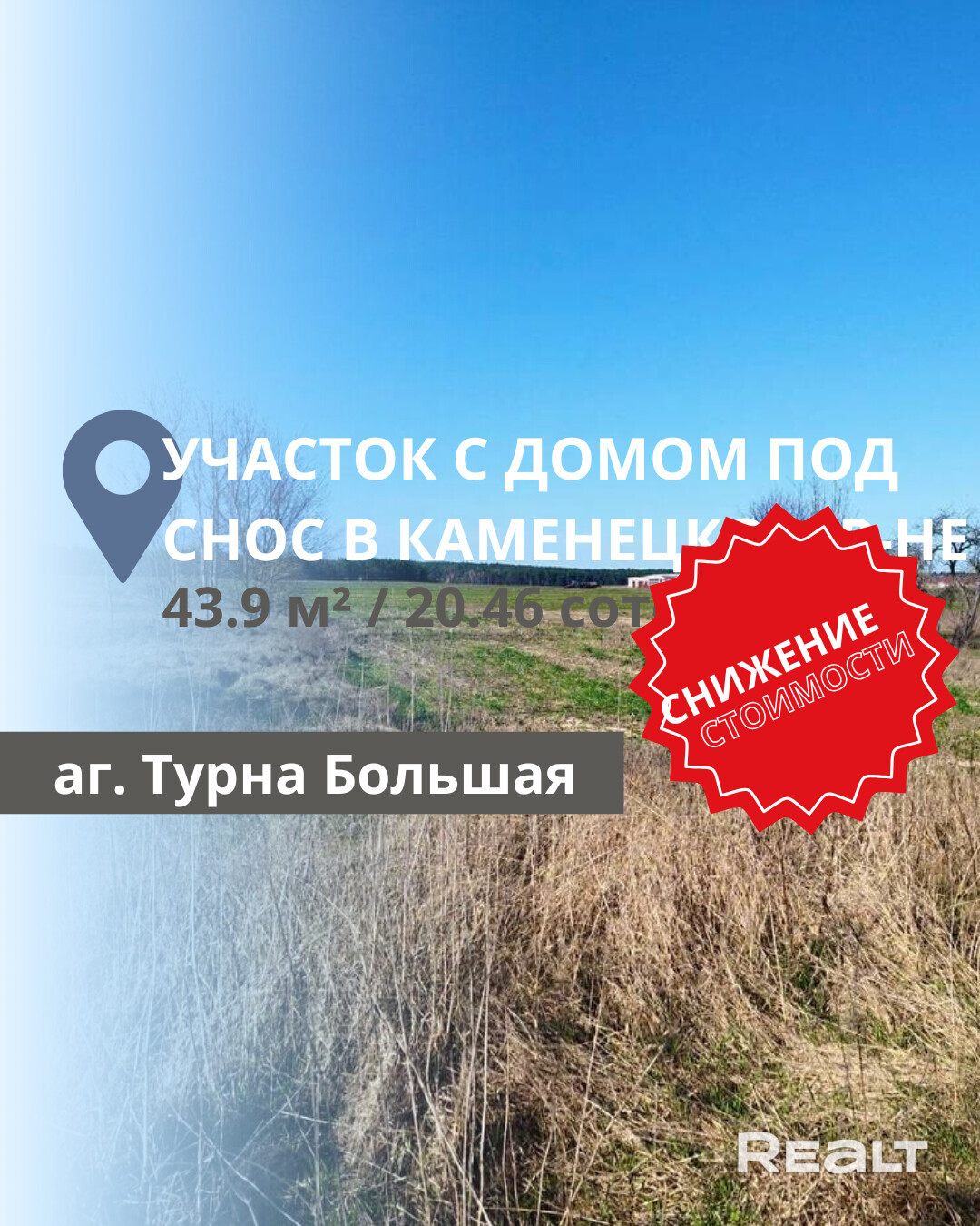 Продается участок с домом под снос в агрогородке Турна Большая, Каменецкий район. Общая площадь дома составляет 43,9 м2, а площадь участка — 20,46 соток. На территории расположена блочная хозяйственная постройка размером 10x10 м, которая использовалась для разведения животных. Все коммуникации находятся по улице, что обеспечивает удобство подключения. Участок отличается хорошим сообщением с Брестом, а также имеет развитую инфраструктуру в агрогородке.