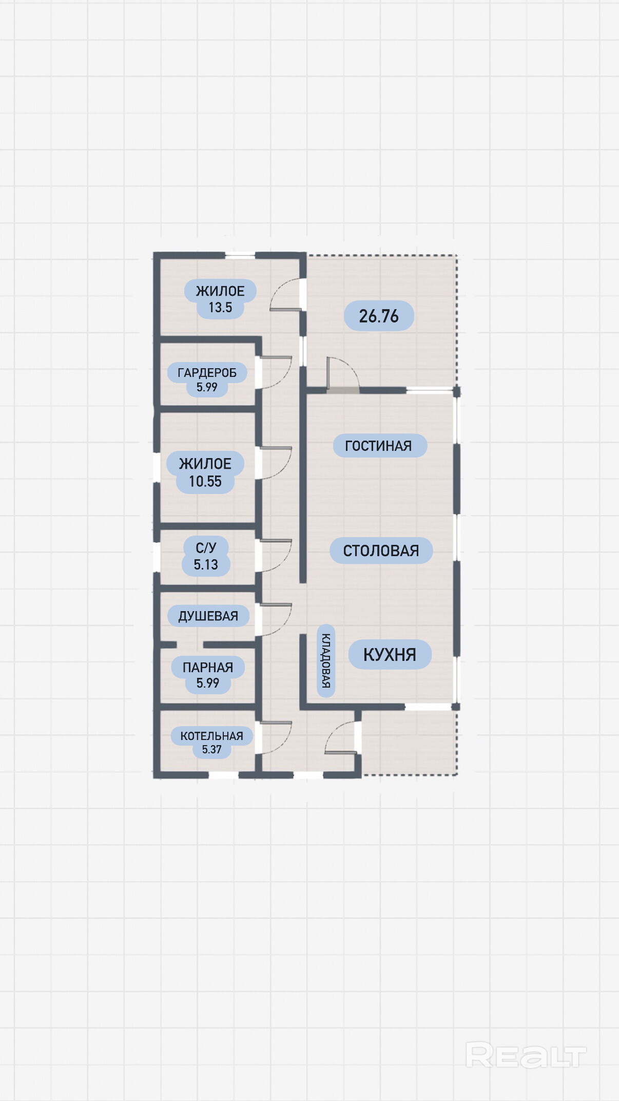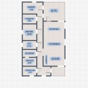 В продаже дом под чистовую отделку в садовом товариществе «Контакт-2009» общей площадью 122,4 м2, расположенный на участке размером 7,16 соток (36 х 20 м). Внутри дома предусмотрены теплые полы и залита финишная стяжка, а электрика разведена по всем помещениям. Стены отделаны финишной штукатуркой, а остекление и фурнитура выполнены от немецкого бренда Roto. Проект включает санузел площадью 5,1 м2 и парную с душевой и предбанником общей площадью 10,8 м2. Также в доме находятся две спальни размером 10,5 м2 и 13,5 м2, гардероб площадью 6 м2 и просторная кухня-столовая общей площадью 63,2 м2 с выходом на террасу площадью 26,8 м2. К кухне примыкает кладовая размером 2,3 м2.