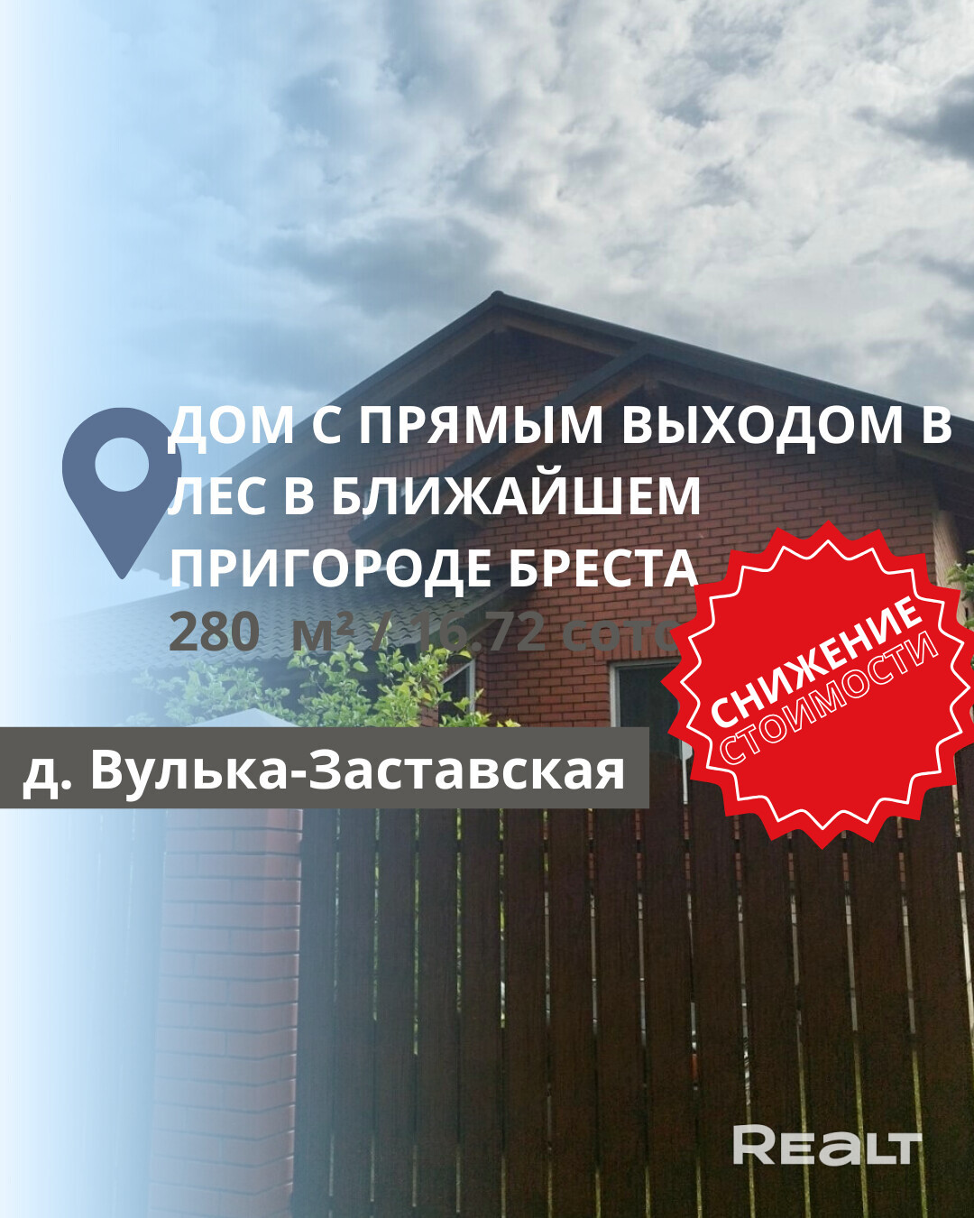 Продается уютный дом в ближайшем пригороде Бреста с прямым выходом в лес, расположенный в деревне Вулька-Заставская на направлении Каменцы-Жировецкой. Общая площадь дома составляет 280 м2, а земельный участок – 16.72 сотки. Возможен обмен с доплатой на квартиру. Дом двухэтажный с высоким цоколем. На первом этаже находятся гостиная, кухня-столовая, две жилые комнаты и раздельный санузел. На втором этаже расположены две жилые комнаты, гардероб и санузел. Также имеется подвал.