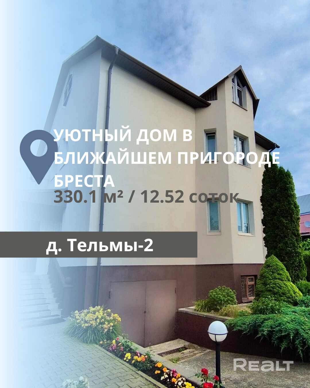 Продается жилой уютный двухэтажный дом в ближайшем пригороде Бреста, в деревне Тельмы-2. Общая площадь дома составляет 330.1 м2, из которых жилая площадь — 145.8 м2. Участок имеет правильную форму и площадь 12.52 сотки. Внутреннее оформление выполнено в светлых тонах с полами и потолками из натурального дерева, что создает атмосферу уюта. В доме расположены 4 спальные комнаты и 2 санузла. Гостиная оборудована камином, а также имеется подвал для хранения. Коммуникации включают электричество, газ (газовое отопление), вода и канализация центральные. Участок ухоженный, на нем высажены туи, плодовые деревья и организованы клумбы, а также огород. На территории присутствуют хозпостройка с баней, теплица и беседка, что делает это предложение особенно привлекательным для комфортной жизни и отдыха на природе.
