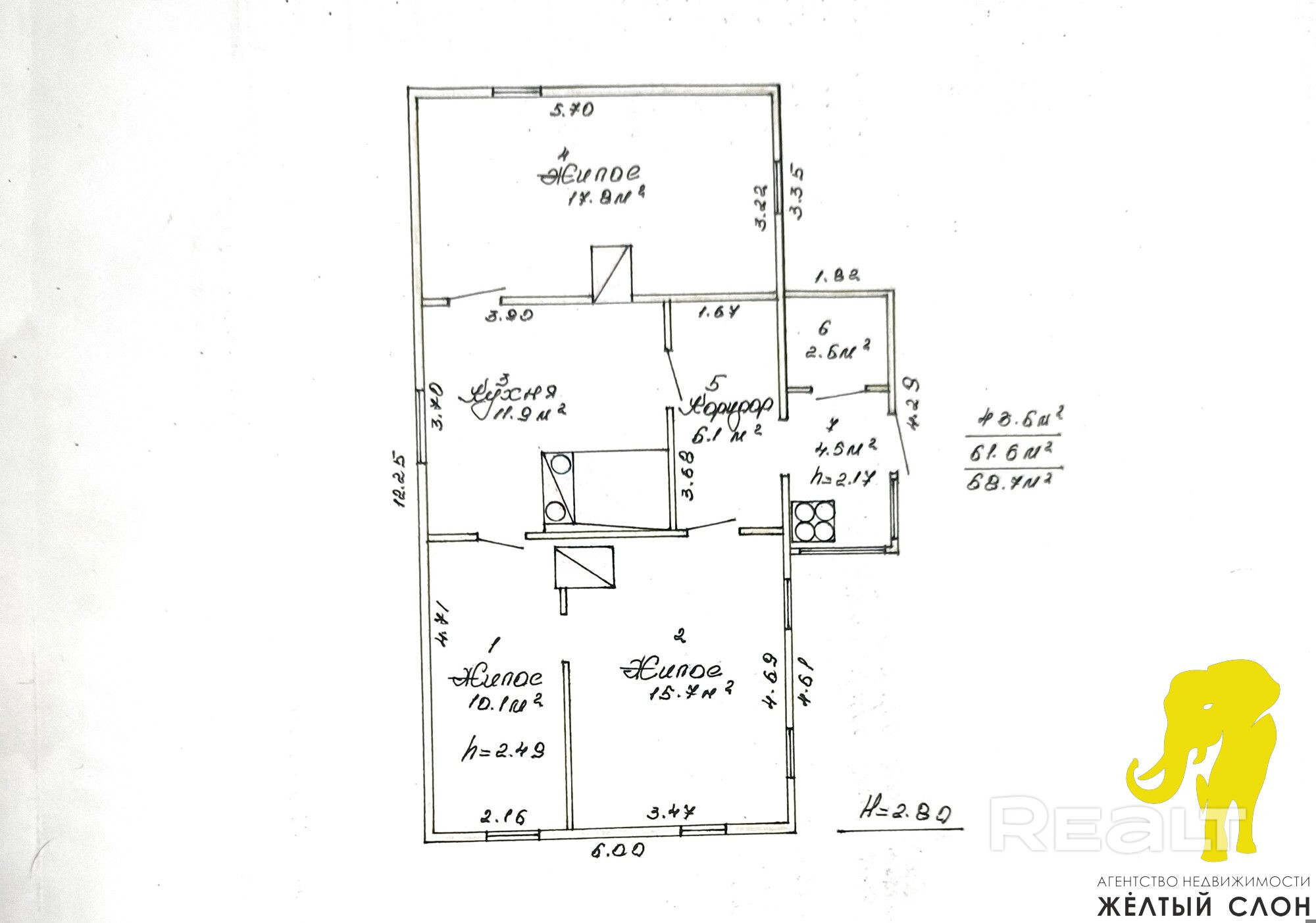 Общая площадь дома – 68,7 м2, жилая – 43,6 м2, кухня – 11,9 м2. Окна – деревянные. Полы – деревянные. Стены – оклеены обоями.