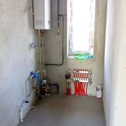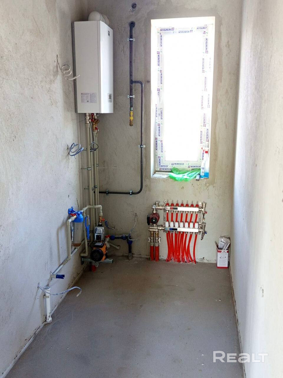 Фундамент — ленточный монолитный, изготовленный из бетона с гравийной подушкой. В доме предусмотрены все необходимые коммуникации: отопление осуществляется с помощью централизованного газового котла, водоснабжение обеспечивается скважиной и гидрофором, электричество подключено централизованно, а канализация — автономная.