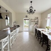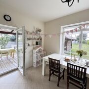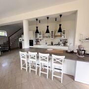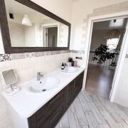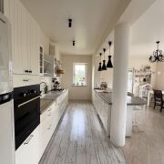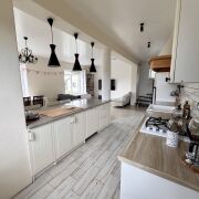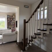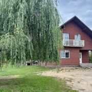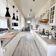Мансардный жилой дом 2015 года постройки в северной части г. Бреста. Стены из газосиликатных блоков 30 см, фасад утеплен минеральной ватой 10 см, облицован кирпичом (Робен) 7 см, двускатная кровля – металлочерепица. Установлены стеклопакеты. Общая площадь 185,5кв.м, жилая 121,8 кв.м.. Функциональный дизайн-проект разработан для пятикомнатного жилого дома. На первом этаже расположены: холл переходящий в общее пространство гостиной, кухни-столовой 42,6 кв.м. с выходом на террасу, гостевая спальня с санузлом, топочная, туалет. В мансардном этаже размещены: холл, четыре изолированные спальни, гардеробная, санузел. Оформление интерьера выполнено в светлых тонах, гармоничное наполнение предметами декора и текстиля, комбинированные полы. Ванные комнаты облицованы керамической плиткой и укомплектована сантехникой. Комнаты обставлены корпусной и мягкой мебелью, встроенный кухонный гарнитур с бытовой техникой. Коммуникации: электричество, газ (отопление - газовый котел), водоснабжение- скважина (централизованное по улице), канализация - автономная. Волоконно-оптический кабель.