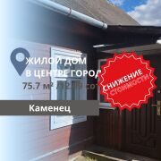 Продается дом в центре Каменца на участке площадью 12.09 соток с двумя заездами. Жилой дом общей площадью 75.7 м2, из которых жилая площадь составляет 39.8 м2, полностью готов к проживанию и продается с мебелью. На территории имеются все удобства, включая местную канализацию, центральный газ и водопровод. Дополняет предложение беседка, погреб и гараж. Ухоженный двор, высажены плодовые деревья.