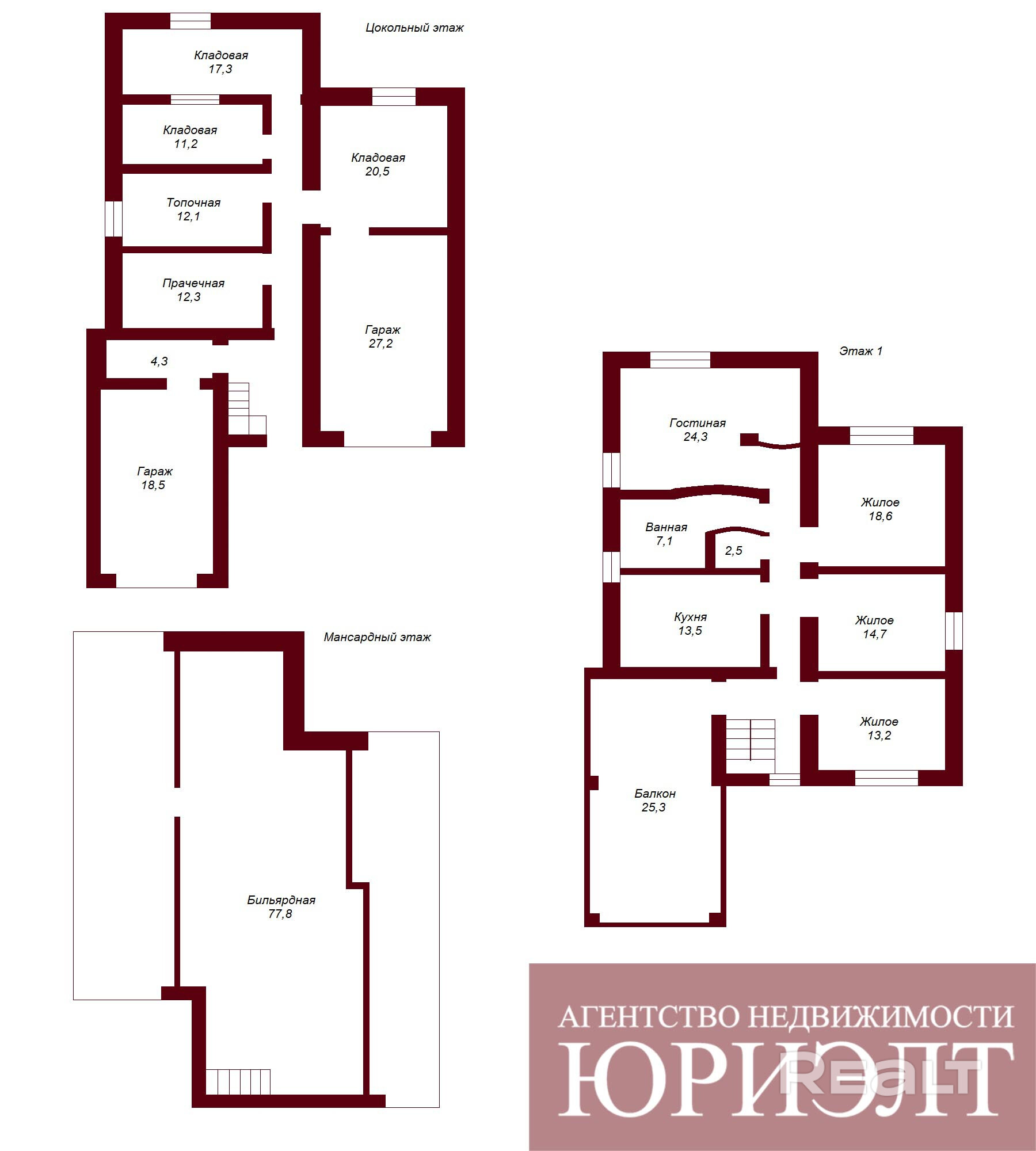 Общая площадь с цокольным и мансардным этажом - 339 м2/ жилая - 148.6 м2/ кухня - 13.5 м2. Имеется 5 жилых комнат, помещения хозяйственного назначения, просторная кухня и терраса, санузел, два гаража.