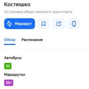 Транспортное сообщение: о.п. «Костюшко», автобус 32, маршрутное такси 35.