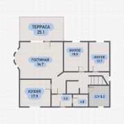 Планировка предусматривает 2 независимые просторные квартиры на каждом этаже. На первом этаже расположена гостиная с выходом на просторную крытую террасу, кухня - коммуникации кухни выведены в помещение на 2 этаже над ней. Также на первом этаже 2 жилые комнаты, туалет и совмещенный санузел.