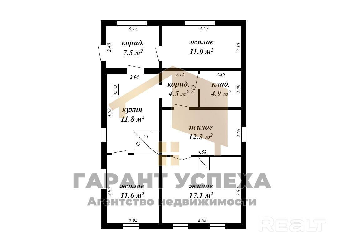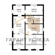 Общая площадь здания составляет 80 кв.м, жилая – 52 кв.м. В доме имеются: кухня площадью 11.8 кв.м, четыре жилых комнаты, одна из которых проходная, два коридора и кладовая.