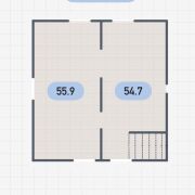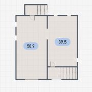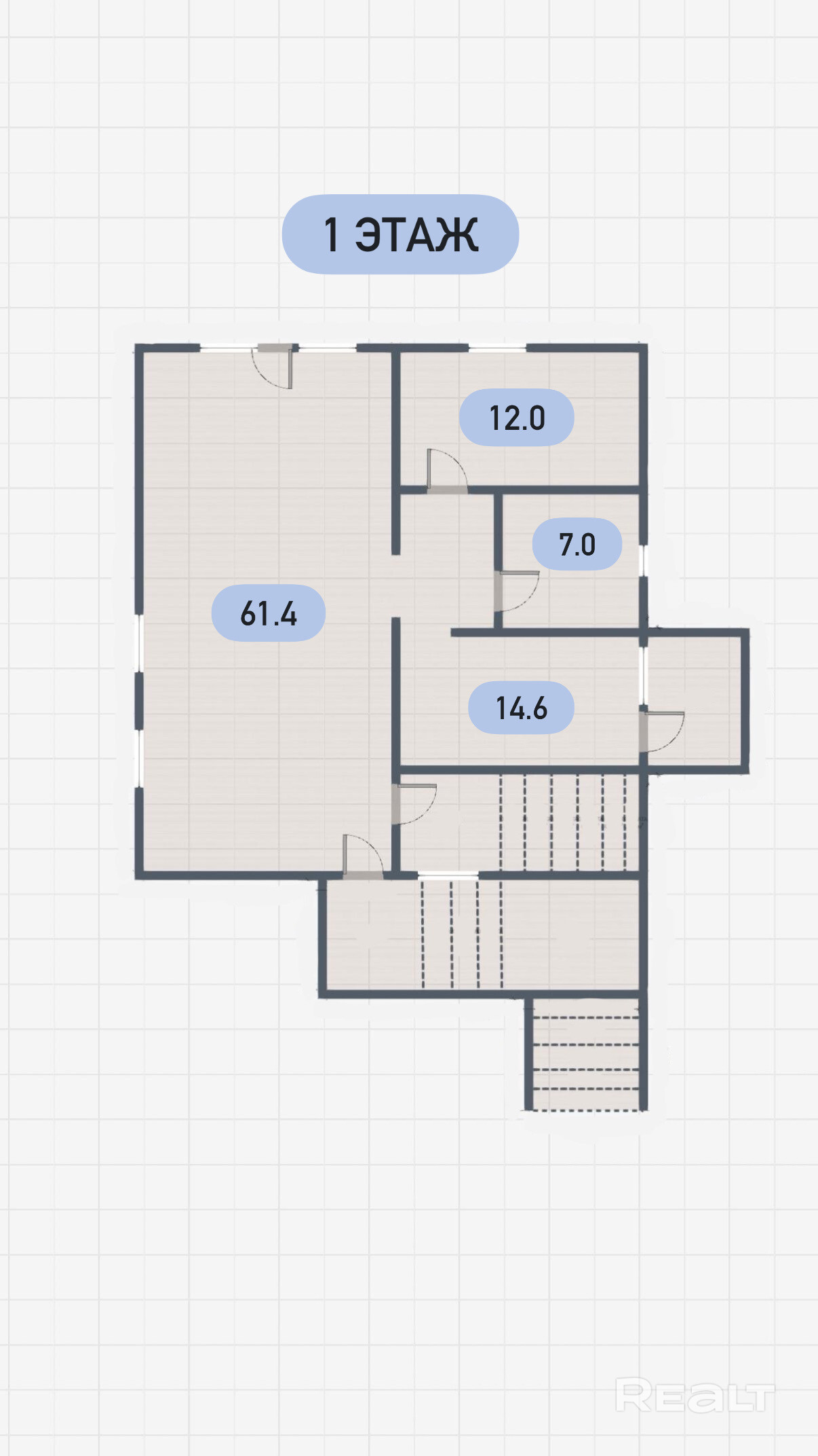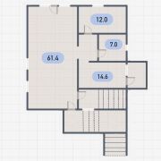 На первом этаже расположены три комнаты (61,4 кв.м, 12,0 кв.м), кухня площадью 14,6 кв.м с выходом на балкон и совмещенный санузел на 7,0 кв.м. Мансардный этаж включает две жилые комнаты площадью 55,9 и 54,7 кв.м. Цокольный этаж состоит из гаража и топочной общей площадью 98,4 кв.м с высотой потолков 2,58 м.