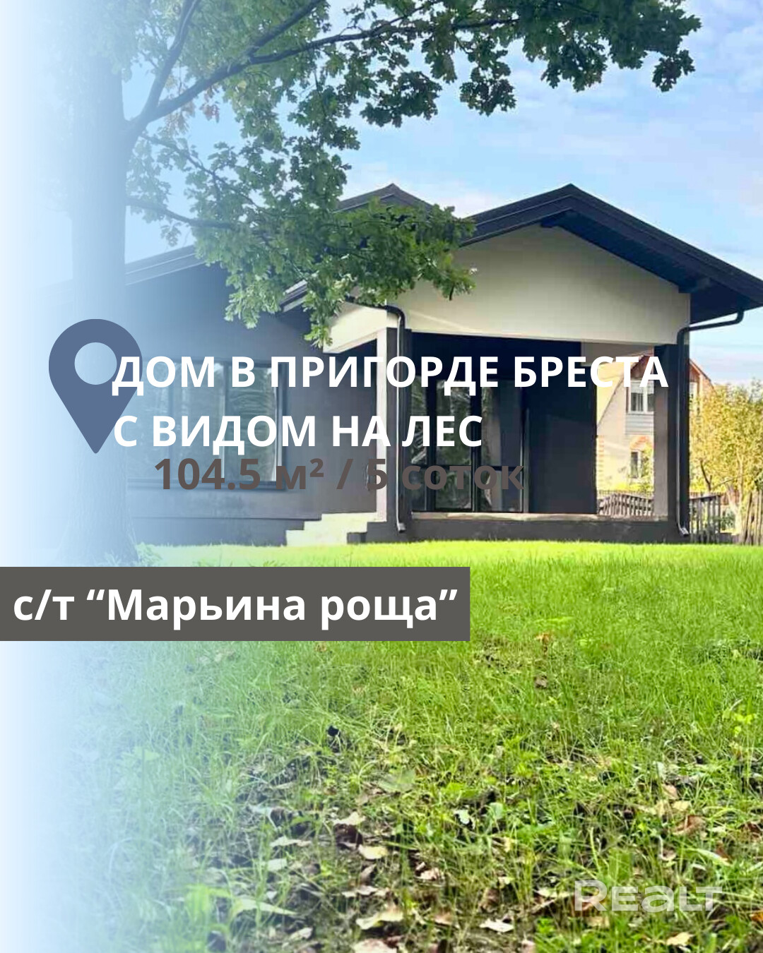 Продается современный одноэтажный дом 104.5 м2 с панорамным видом на лес (плюс терраса 16 м2)! Уединенная и тихая локация всего в 9 км от городской суеты Бреста. Дом расположен в садовом товариществе «Марьина роща» (направление Каменицы Жировецкой, д. Заболотье) Идеальное сочетание приватности и доступности инфраструктуры.