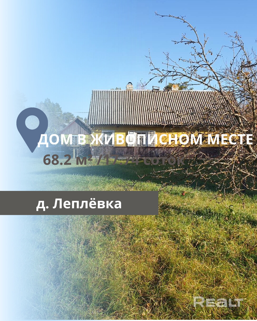 Продается жилой дом в Брестском районе, в д. Леплёвка, построенный в 1925 году. В доме две комнаты, общая площадь 68,2 кв.м, из которых 36,5 кв.м составляют жилые площади Кухня площадью 10,4 кв.м. Высота потолков составляет 2,30 м.