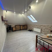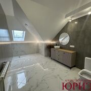 Окна ПВХ фирмы Velux. Стены оклеены обоями, натяжные потолки, на полу — ламинат и плитка. Предусмотренно много сценариев освещения. Современный кухонный гарнитур в светлых тонах укомплектован всей необходимой техникой.