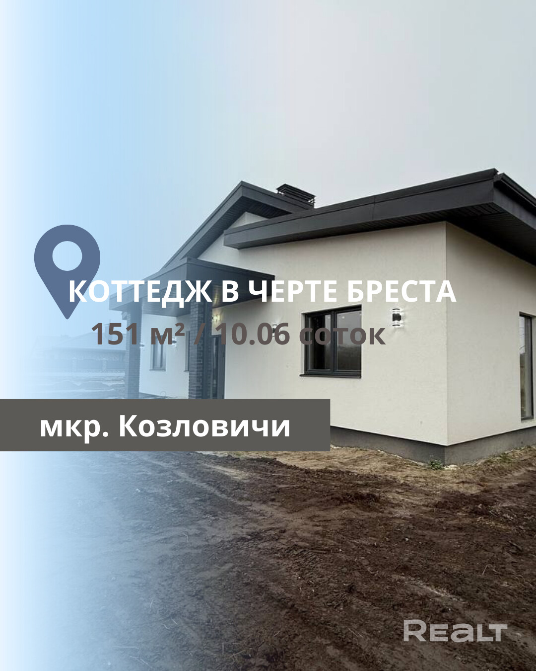 В микрорайоне Козловичи города Бреста продаётся новый просторный современный жилой дом, построенный в 2025 году и находящийся на стадии чистовой отделки. Общая площадь дома составляет 151 м2, из которых жилая площадь — 45,8 м2, а кухня совмещена с просторной гостиной площадью 42,57 м2 и имеет выход на террасу площадью 10,24 м2. Высота потолков варьируется от 3 до 5 метров, что придаёт помещению особую воздушность и простор. В доме предусмотрены три спальни, два санузла и кабинет площадью 7,38 м2. Дом одноэтажный, построен из газосиликатных блоков и утеплён пенополистиролом толщиной 10 мм. Фасад отделан штукатуркой в стиле "американка", а кровля выполнена из металлочерепицы. Фундамент — ленточный монолитный бетонный. Полы оборудованы системой подогрева, а обогрев дома осуществляется с помощью газового котла и бойлера косвенного нагрева для мгновенной подачи горячей воды. Все коммуникации — водопровод, канализация, электричество и газ — централизованные. В доме также проведён оптоволоконный кабель от "Белтелекома". Участок ровный правильной прямоугольной формы общей площадью 0,1006 соток с хорошими подъездными путями. Остановки общественного транспорта находятся в шаговой доступности, что обеспечивает удобное сообщение с городом