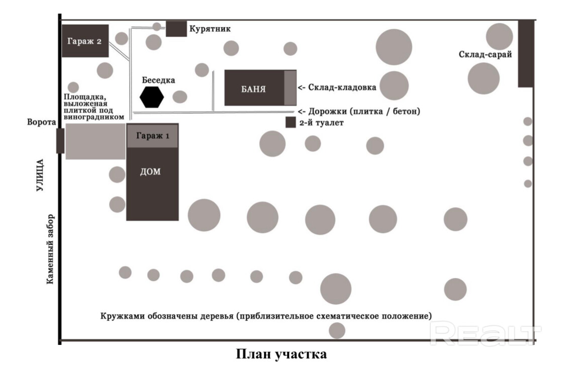 На участке также располагаются удобный непромерзаемый погреб для хранения закаток, три больших сухих чердака для хранения вещей, блочный курятник на 30 курей, теплица-парник и два склада-сарая для хранения дров и инвентаря. Гаражи могут использоваться как летняя кухня, в которой установлен газ и проведена вода. Баня представляет собой небольшой жилой комплекс с парилкой, ванно-мытьевой комнатой, большой застекленной верандой-гостиной и просторной спальней для гостей. Установлен бойлер на 50 литров для подогрева воды.