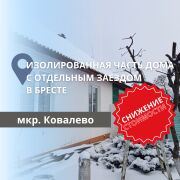 Продаётся часть жилого дома, 2 комнаты, (1/2 доли) в микрорайоне Ковалёво, построенного в 1962 году. Дом выполнен из строительного бруса, фасад утеплён, оштукатурен и окрашен, с двускатной крышей, покрытой шифером. Общая площадь составляет 67.2 кв.м., жилая — 45.1 кв.м., кухня — 8.3 кв.м. Внутри установлены окна ПВХ, потолки натяжные с дополнительной подсветкой, а стены оклеены обоями. Санузел раздельный, облицованный керамической плиткой. При продаже остаётся кухонный гарнитур, шкаф и частично мебель. Коммуникации включают централизованное электричество, газ, водоснабжение и канализацию. Земельный участок площадью 10.85 соток огорожен забором с металлическими воротами, на территории имеется сарай. Асфальтированные подъездные пути обеспечивают удобный доступ. В непосредственной близости расположены магазин Мартин, Евроопт, банк, аптека и остановка общественного транспорта.