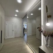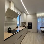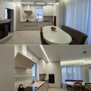 Интерьер выполнен в современном премиум-стиле: светлая палитра, встроенная мебель по индивидуальному проекту, качественная бытовая техника BOSCH, продуманное сценарное освещение. Большие окна наполняют дом светом и создают ощущение единения с природой.
