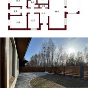 Площадь дома — 141,8 м2. Планировка продумана до мелочей: просторная кухня-гостиная с камином, три жилые комнаты, отдельная гардеробная, два санузла — с душевой кабиной и ванной с джакузи.
