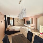 тип — шале, общая площадь — 100,5 кв.м, жилая составляет 66,7 кв.м., 3 жилые комнаты, большая кухня-столовая с тёплым полом , совмещённый санузел, просторная входная терраса, металлическая входная дверь.
