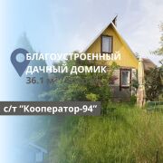 Дачный дом на садовом участке в СТ "Кооператор". Материалы дома: газосиликатные блоки, на фасаде - декоративно-отделочная штукатурка, кровля - шифер. В доме на первом этаже расположена кухня , комната и прихожая, установлена лестница. На мансардном этаже расположена просторная комната и балкон, кладовка. Отопление печное, есть камин.