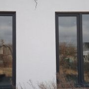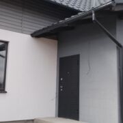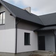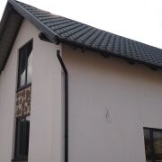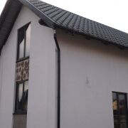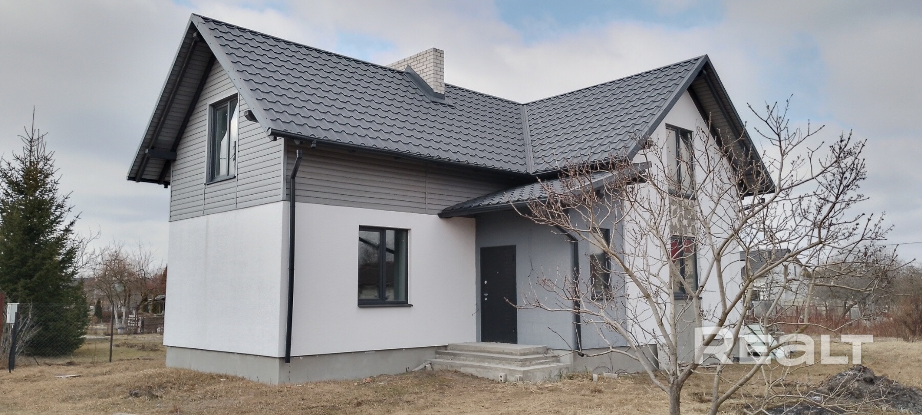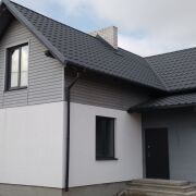 Фундамент дома - ленточный / армированный бетон/. Стены – из газосиликатных блоков. Ж/б плиты перекрытий. Фасад дома утеплён. Отделан декоративно-защитной штукатуркой "Американка", с нанесение стойкой к УФО фасадной краски. Эффектно подчеркнут виниловым сайдингом, сочетающимся с кровлей из металлочерепицы. Окна ПВХ с наружной ламинацией цвета графит. На входе- металлическая входная дверь актуального дизайна. Общая площадь дачного дома 81 кв.м,жилая- 66,4 кв.м, кухня-гостиная 30,8 кв.м.