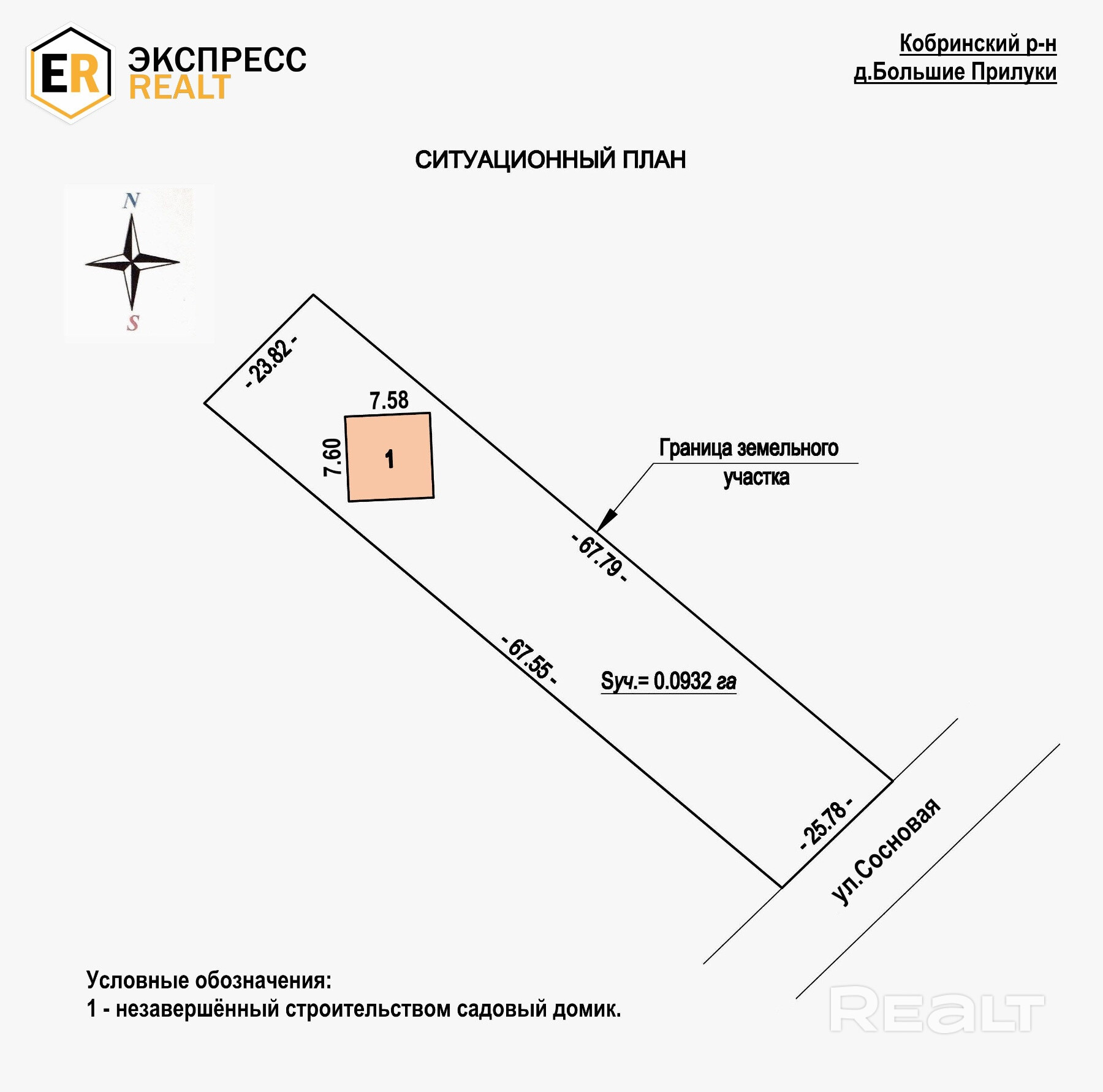 Продаётся незавершенный строительством законсервированный садовый домик в д.Большие Прилуки Кобринского р-на. Участок площадью 9.32 сотки прямоугольной формы в плане, высокий, огорожен по периметру сеткой рабица, с удобными подъездными путями. На участке расположен фундамент незавершённого строительством садового домика (13% готовности, высота подвала - 2.50м), высажен сад из плодовых деревьев. Инженерные коммуникации - центральное электроснабжение 220/380В, также подведена линия с возможностью подключения электрического отопления (усиленное трёхфазное электричество). Отличная локация - тихое живописное место, за участком сосновый лес, в 300м протекает р.Мухавец. Участок находится в 7км к северо-востоку от Кобрина, с возможностью выезда на трассу Р-2 и М-1. В соседней деревне продуктовый магазин и отделение почты. Один собственник. Реальному покупателю - торг при осмотре. ООО «Экспресснедвижимость-риэлт», УНП 193505113, лицензия 02240/409 от 05.03.2021 г., договор на оказание риэлтерских услуг 85/6 от 13.03.2025 г.