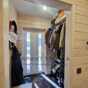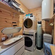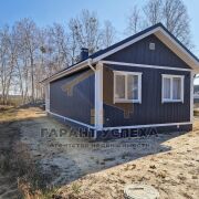 Давайте разберемся, как он устроен. Дом каркасный, заводского изготовления, стоит на свайном фундаменте. Стены 200 мм, каркас, заполненный минеральной ватой, обшит сайдингом. Полы финская фанера, ОСБ плита, далее теплые полы, ламинат, плитка. Окна ПВХ, кровля – металлочерепица. Обустроена крытая терраса выходом из кухни. Внутри стены из блок хауса из лиственницы.