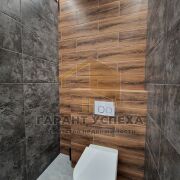 Ванная отдельно от туалета. Тут все выдержано в серых тонах с использованием плитки с рисунком «под дерево». Подсветка по периметру создает вид парящего потолка.