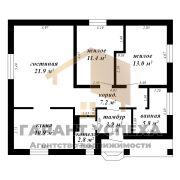 Общая площадь дома составляет 76,9 кв.м, жилая – 46,3 кв.м. Основным помещением является просторная кухня-столовая общей площадью 32,8 кв. м. Также в доме имеются ещё две жилые комнаты, совмещённый санузел, коридор, тамбур и топочная.