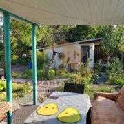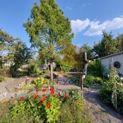 Помимо дома на участке расположены хозпостройка с подвалом и уличный туалет. По территории высажены многолетние деревья, кустарники, виноградная лоза, имеется небольшой декоративный водоём.