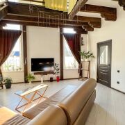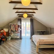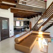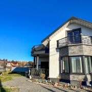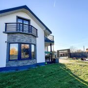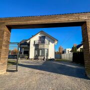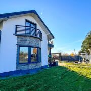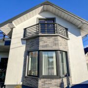 Фундамент – армированный бетон. Стены – г/с блоки (30 см), утеплены, оштукатурены и окрашены, эркерные части и вход в дом выделены декоративной плиткой. Крыша – металлочерепица. Окна ПВХ. Дом полностью готов к проживанию: полы – керамогранит, ламинат, плитка; потолки – окрашены, выполнена имитация балок перекрытия; стены – частично окрашены, частично оклеены обоями.