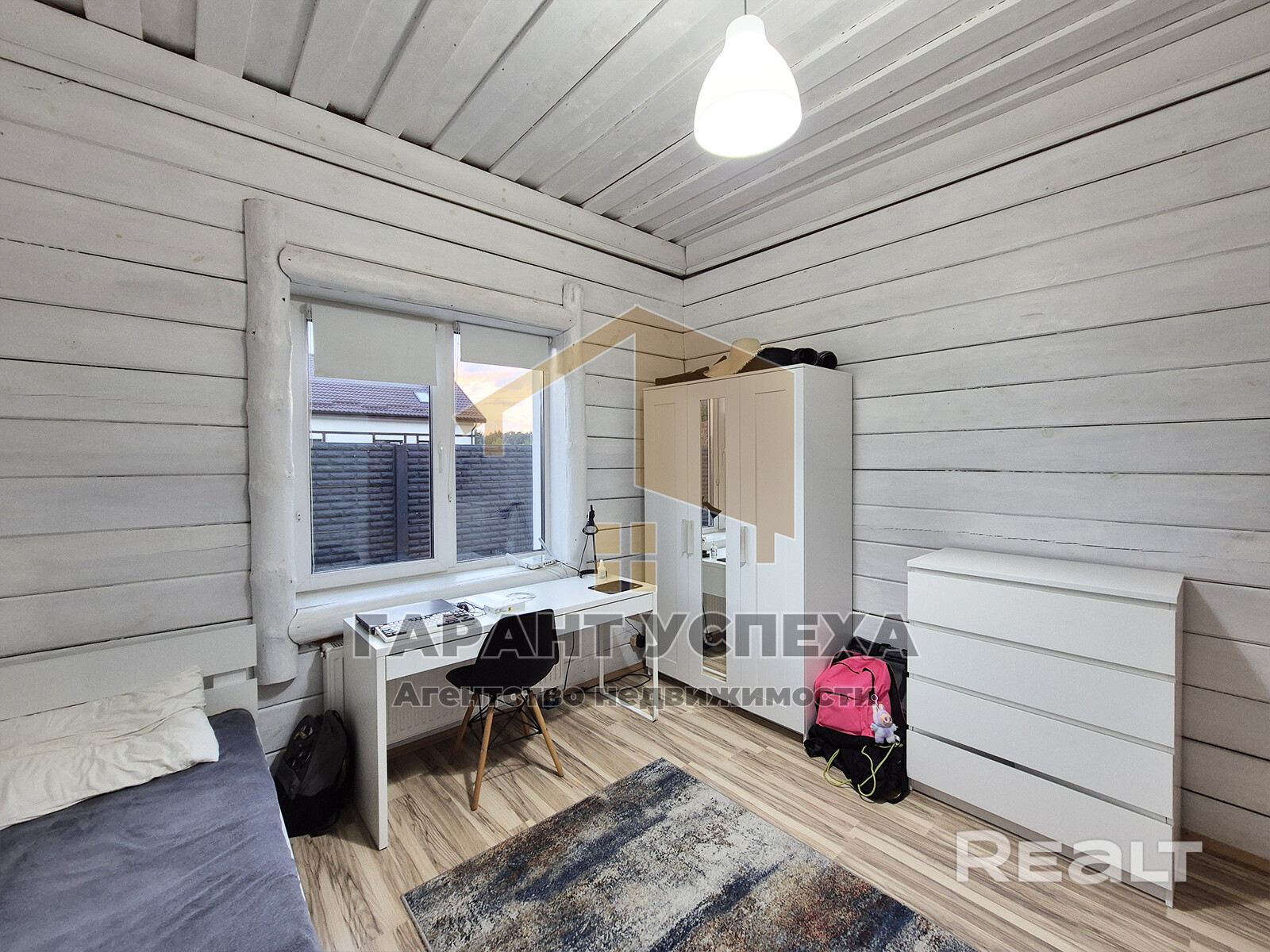 Вторая половина дома разделена на 2 симметричные комнаты и совмещённый санузел. Здесь также предпочтение в интерьере отданы натуральным материалам.