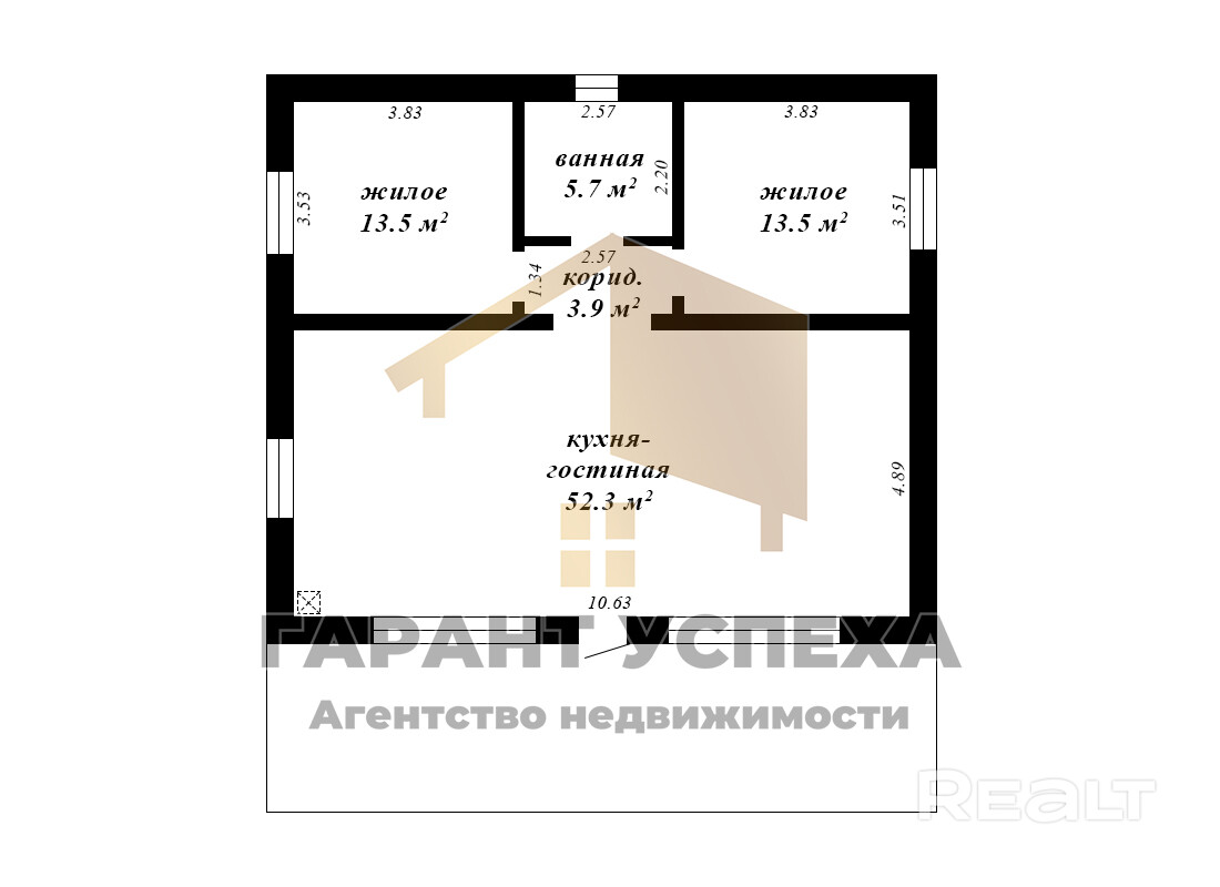 Общая площадь – 88,9 кв. м, жилая – 27 кв. м, Просторнейшая кухня-гостиная 52,3 кв. м. Две жилые комнаты по 13,5 кв. м. Совмещенный санузел 5,7 кв. м. Высота потолка – 2,99 м.