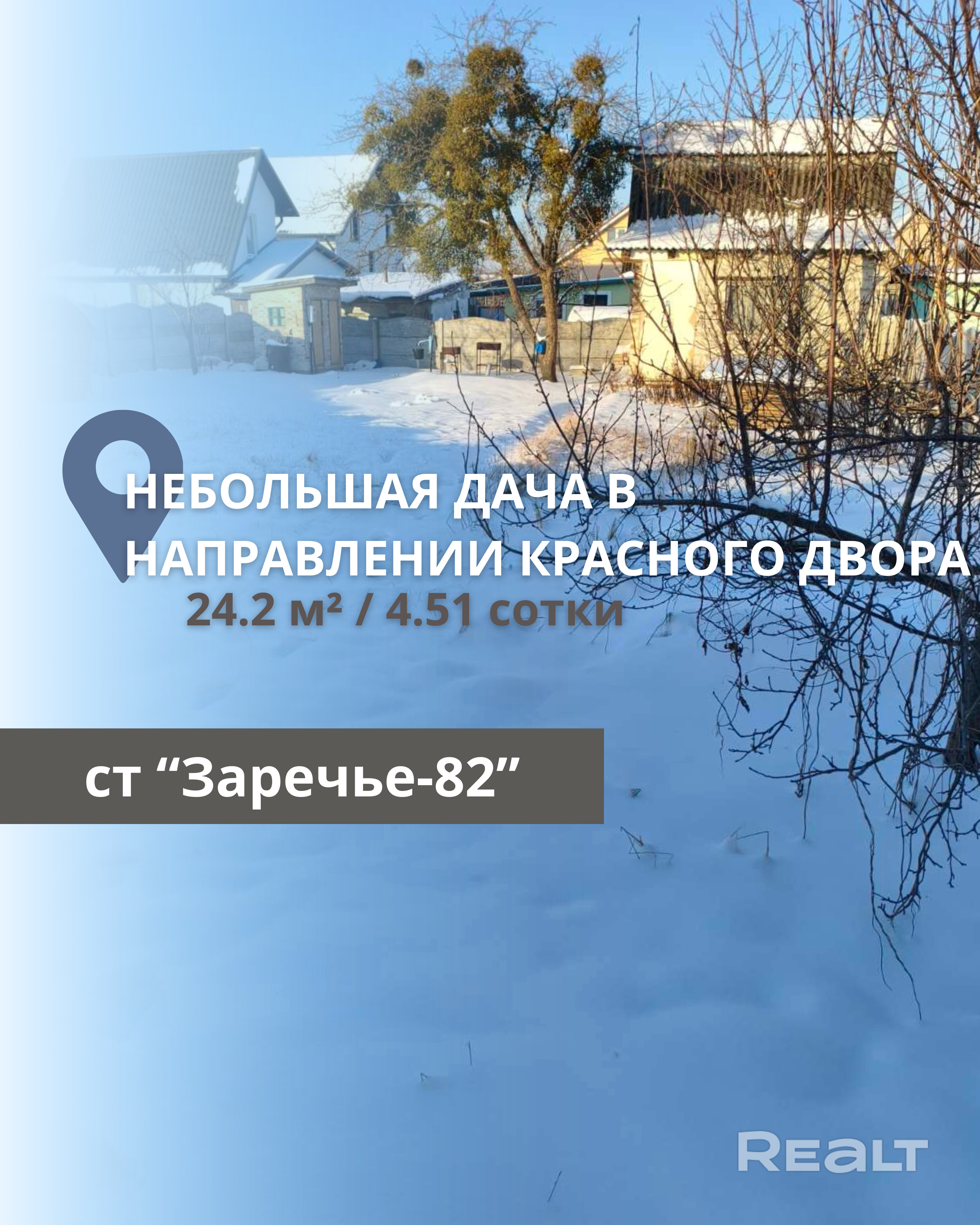 Продаётся уютный дачный домик в садоводческом товариществе Заречье-82, расположенном в направлении Каменицы-Жировецкой, Мухавецкий сельсовет, Брестский район, Брестская область. Общая площадь дома составляет 24.2 кв.м, он был построен в 2014 году. Облицован кирпичом, крыша покрыта шифером. Газ проходит по улице, электричество в доме, вода из скважины. Санузел находится на улице. Участок площадью 4.51 сотки имеет правильную форму и огорожен бетонным забором, оснащён калиткой и воротами из металлопрофиля. Асфальтированная дорога ведёт к даче, рядом расположена автобусная остановка с маршрутом "Радуга". В непосредственной близости находятся дачное озеро и круглогодичный ларёк с необходимыми товарами, а также магазины Евроопт и озеро на Красном дворе.